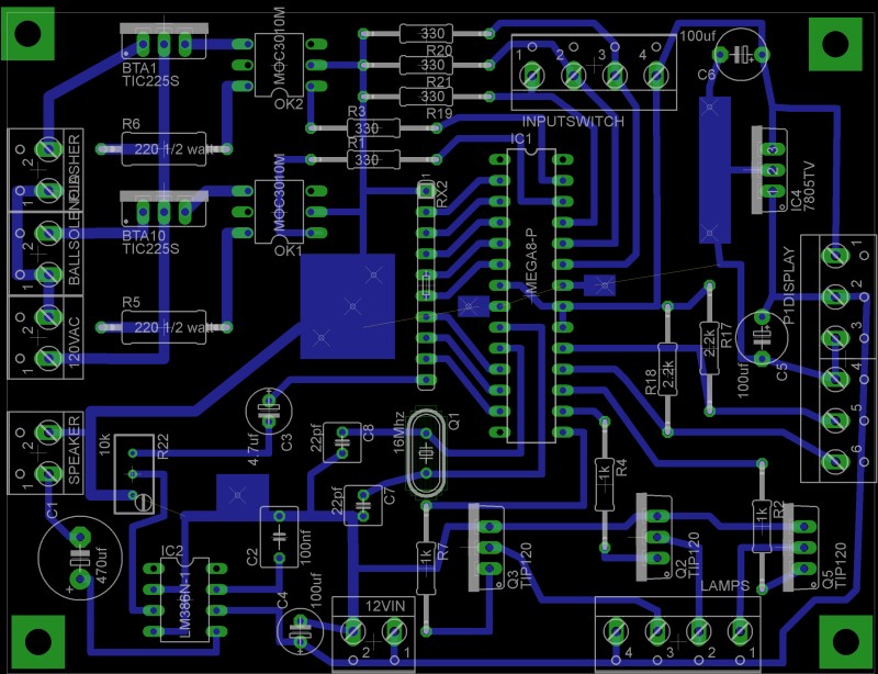 The following image is my current board design. I managed to keep it all on one layer (with only a few jumper wires, all of which are ground) since I wanted to be able to easily make the board at home. The top left side of the board is the high voltage side / 120V side. The bottom left is the audio amplifier using a LM386. Top right are the switch inputs and the 5V voltage regulator powered from a 12V wall-wart that powers the lamps in the display. The right side of the board is the connector to the existing score display. The bottom of the board is for the 12V power in and the header for the three 12V lamps we need to control. The entire board is 4″ by 3″, which I’m happy with considering the original board was 10 x 12.