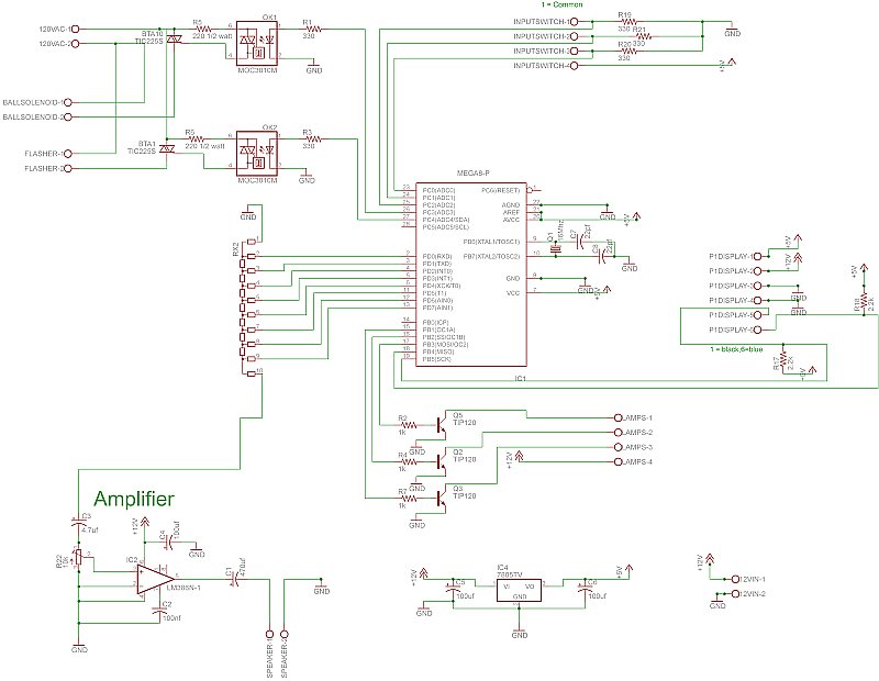 Inputs for the game are comprised of seven normally open contact switches. One for the start switch (I hot wired a start button on the front of the game long ago bypassing the coin mechanism). One switch lies in the ball out trough indicating when a ball is out of play. The other five switches lie behind each of the five scoring holes (10,20,30,40,50). All five scoring switches share a wire pair, so in order to tell what score you made on a ball we need to keep track of the number of pulses on the scoring line before the ball activates the ball out switch. The circuitry to pull this off is bread-and-butter stuff if you’ve ever messed with a microcontroller. The software is the fun part of this since it has to handle switch debouncing and keep track of all of the game logic.