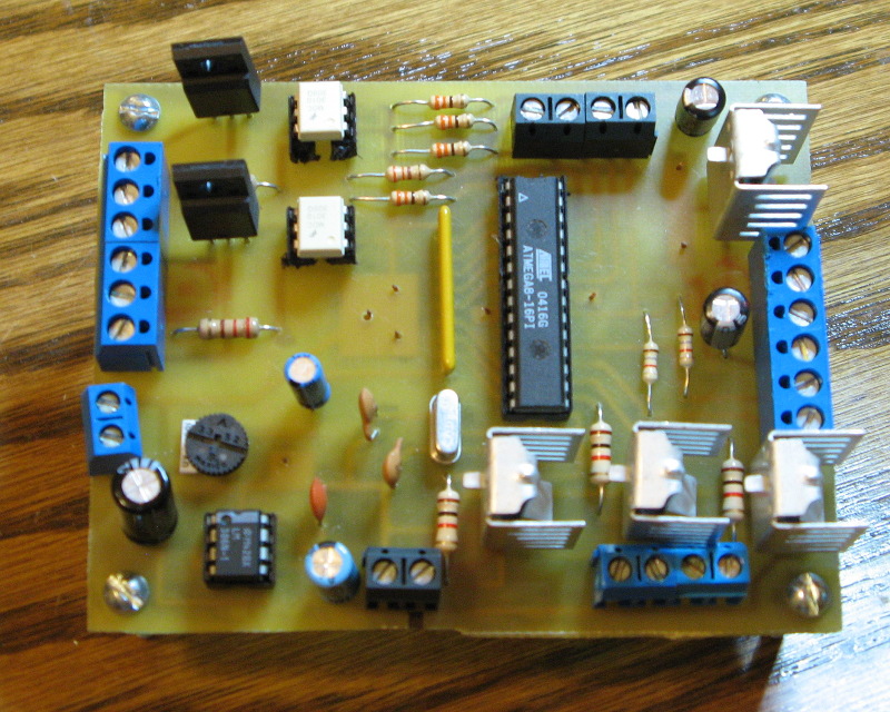 The heart of the board is an Atmel Atmega8 running on a 16Mhz external crystal. Everything else connects to the board via small screw terminals. Connected to the terminals are connector cables with Molex ends that mate to the existing system. I couldn’t find the appropriate type / gender of board mount Molex connectors to keep it all on the board . Maybe on the next version. The circuit and board were designed using Eagle by CadSoft. The circuit: