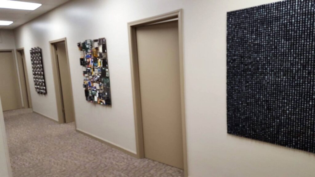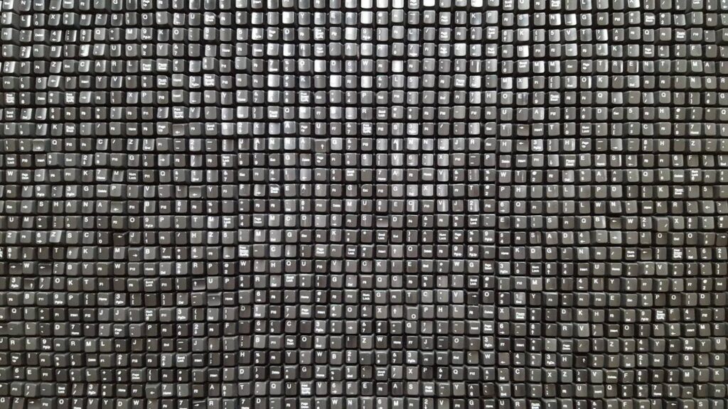 The keyboard wall is made from the keys of about two dozen salvaged keyboards. We let people come in and put their names in and then filled in the rest … after embedding some hidden messages.