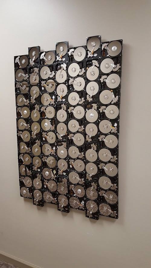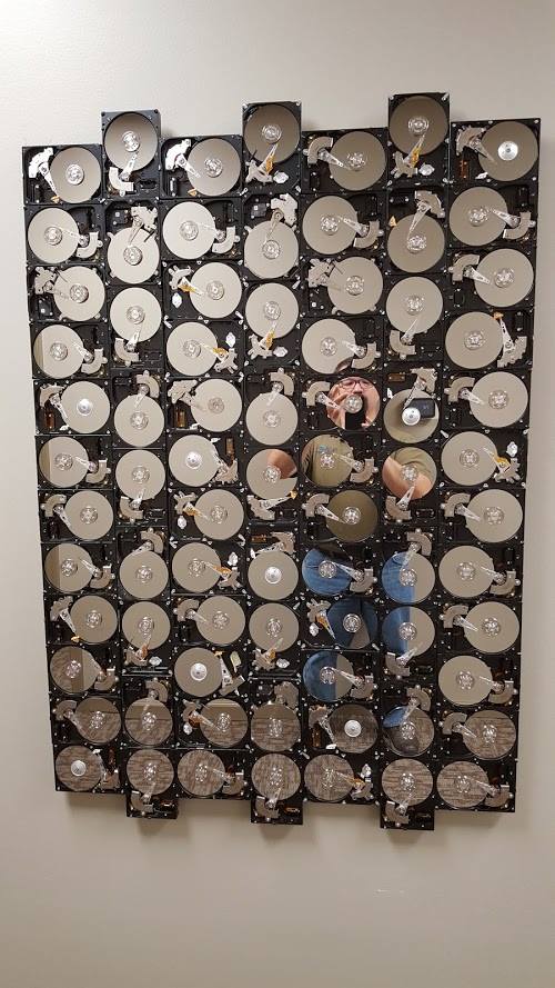 The hard drive mirror is made from 75 old hard drives with their shiny internals exposed. The end result is a fractured, somewhat psychotic, mirror. This one seems to be the most popular for some reason.