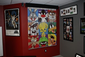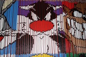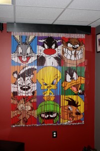 The Looney Toon Wall, or as it is known in the house “The Bead Project”, is made of 57,024 Perler beads that have been strung together. Perler beads are little plastic beads that you are supposed to place on pegboards and then fuse together with an iron. They are inexpensive and come in a large variety of colors which is what made them attractive for creating a mosaic.