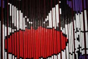 The process for creating the script for this project was much like the process used to create the Lego mosaics: find a pic, reduce the resolution and color palette to match the medium and then create a script. The script was basically string 1 : 2 blacks, 14 reds, 1 white, 1 black …. etc. etc.